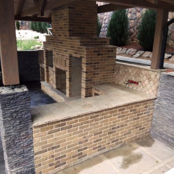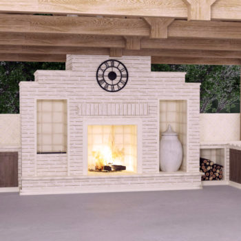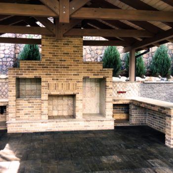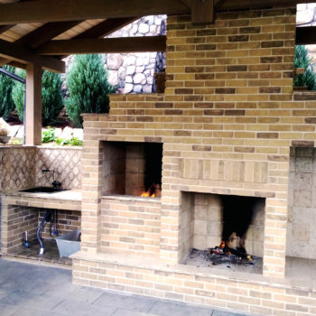 Один из сложных в техническом исполнении барбекю комплексов, спроектированный и реализованный нашей командой. В барбекю комплекс входит мангал, ниша под тандыр со своим дымовым каналом, и во главе композиции открытым камином. В комплексе расположена мойка и рабочая столешница., а перпендикулярно к очагу расположена зона отдыха, барная стойка. Технически было очень сложно реализовать совмещение дымовых каналов, их здесь целых три, и недостаточно места для дыма сборников, а увеличение в высоту барбекю комплекса привело бы к нарушению композиции проекта, архитектор не позволил нам отходить от общей концепции. Каналы из кирпича сложить было не возможно, они забирали драгоценное место, по этой причине было принято решение все внутренние каналы заливать из особо прочного термостойкого ( с температурой выдерживающий постоянный нагрев до 1000 градусов) цемента., тем самым мы смогли сократить объём, который бы заняла кирпичная кладка, и освободить его для дыма.